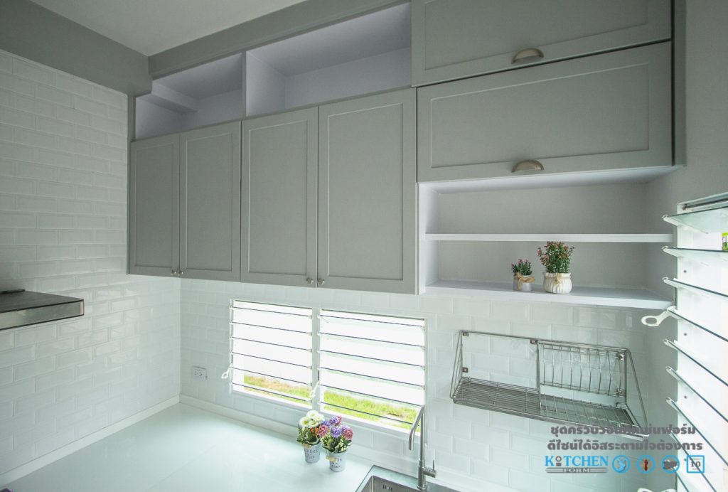 มากันที่โทนสีของชุดครัวชุดนี้กันครับ โดยโทนสีนี้ทางคุณอนุสรณ์ เป็นคนเลือกเองซึ่งตอบโจทย์กับไลฟ์สไตล์ของคุณอนุสรณ์ ได้เป็นอย่างดี โดยสีภายนอกนี้ได้ใช้เป็นสีพ่น 8290 Prairie smoke ของ TOA  ซึ่งเป็นสีเทาอ่อน พ่นทั้งเคาน์เตอร์ล่างและตู้ลอย ส่วนสีภายในทางเราได้ปิดผิวด้วยลามิเนตสีขาวด้าน