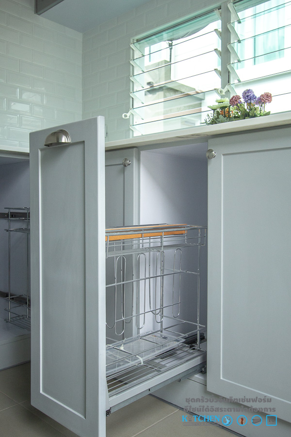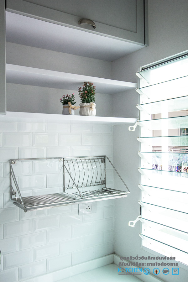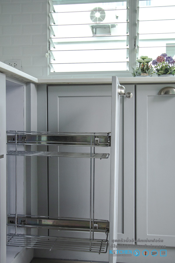 มาถึงอีกหนึ่งส่วนสำคัญ นั้นก็คืออุปกรณ์อำนวยความสะดวกภายในตู้ไม่จะเป็นชุดตะแกรงเอกประสงค์ ที่สามารถจัดเก็บสิ่งของต่างๆ ชุดตะแกรงใส่ขวดเครื่องปรุงเพื่อความเป็นระเบียบเรียบร้อยในการหยิบจับใช้สอย และชุดตะแกรงพักจานแบบติดผนังตรงบริเวณซิงค์ เพื่อความสะดวกในการล้างจาน พักจาน รอแห้ง