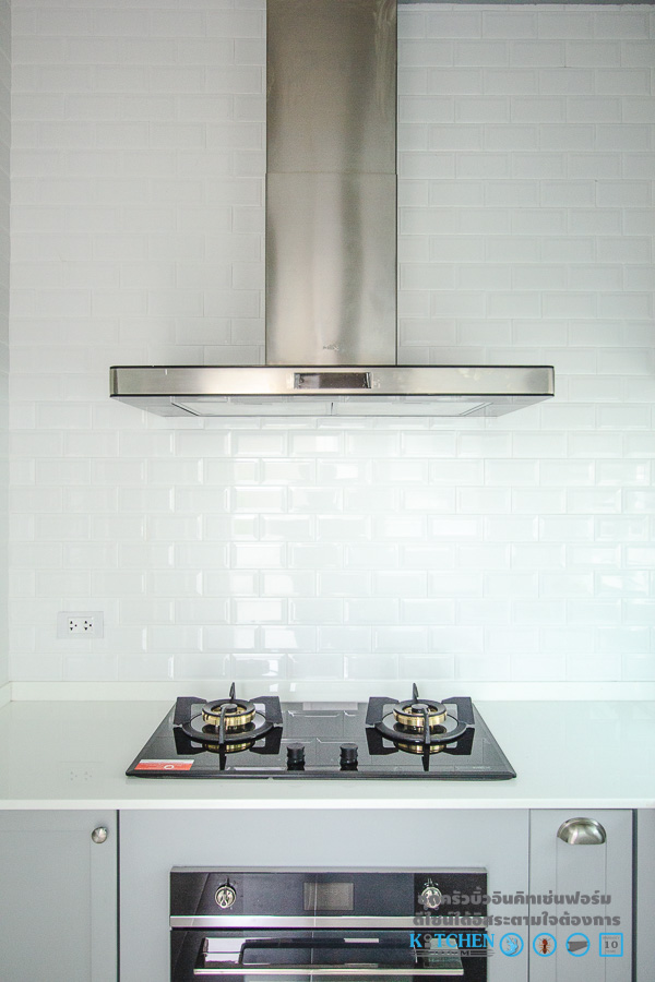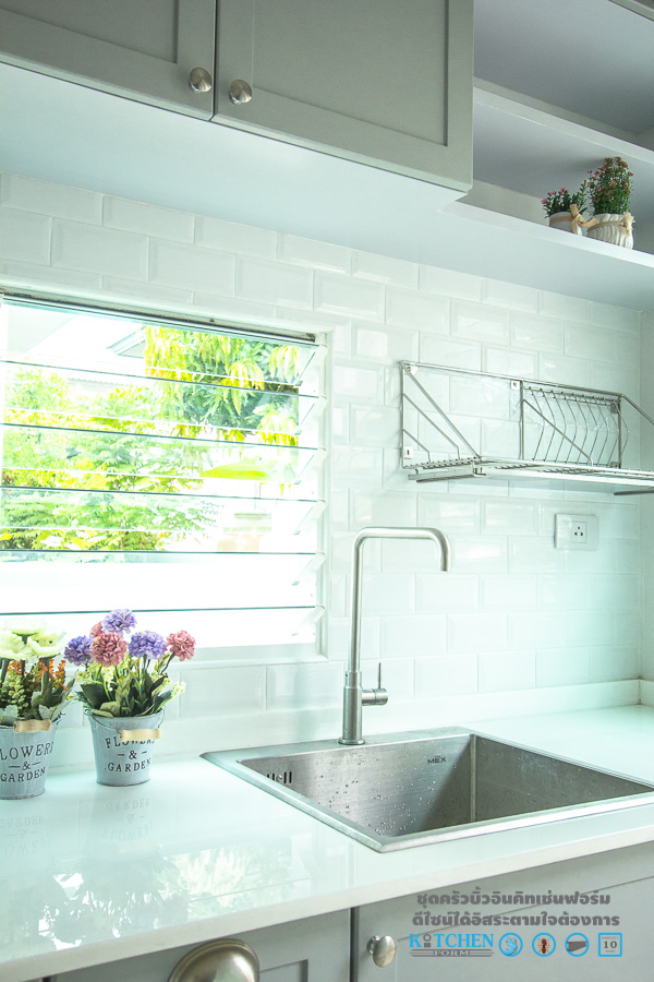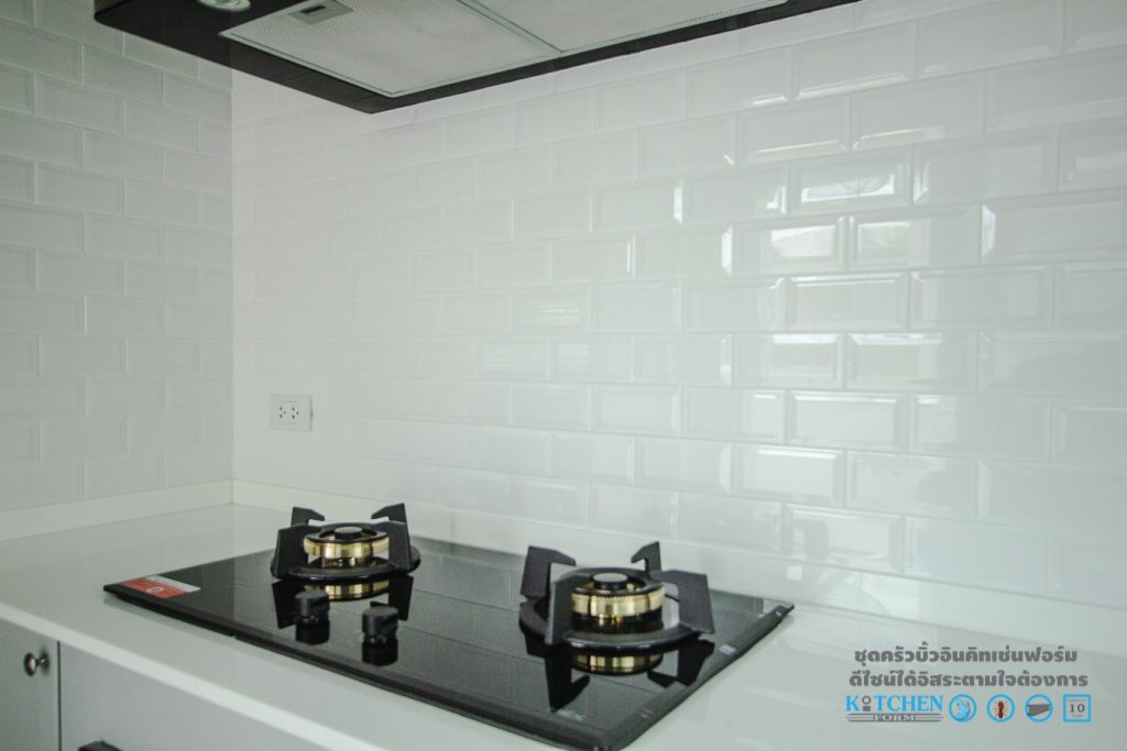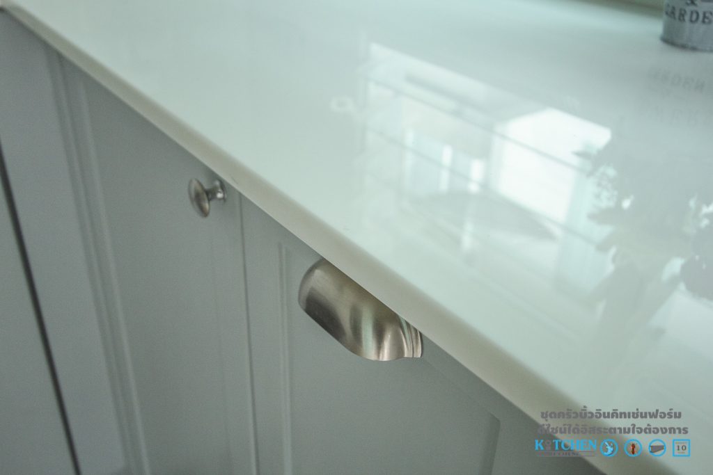 มาต่อกันที่หน้าท็อป ซึ่งเป็นอีกหนึ่งส่วนประกอบสำคัญที่จะช่วยให้ชุดครัวของเรานั้นดูสวยงามสมบูรณ์ยกระดับชุดครัวให้มีความโดดเด่น ด้วยหน้าท็อปหินสังเคราะห์เนื้อแข็งสีขาว รับกับกระเบื้องแผ่นเล็กสีขาวแบบนูนที่ประดับอยู่ที่ผนัง ซึ่งจะเพิ่มความมีเอกลักษณ์และดูสะดุดตามากยิ่งขึ้น