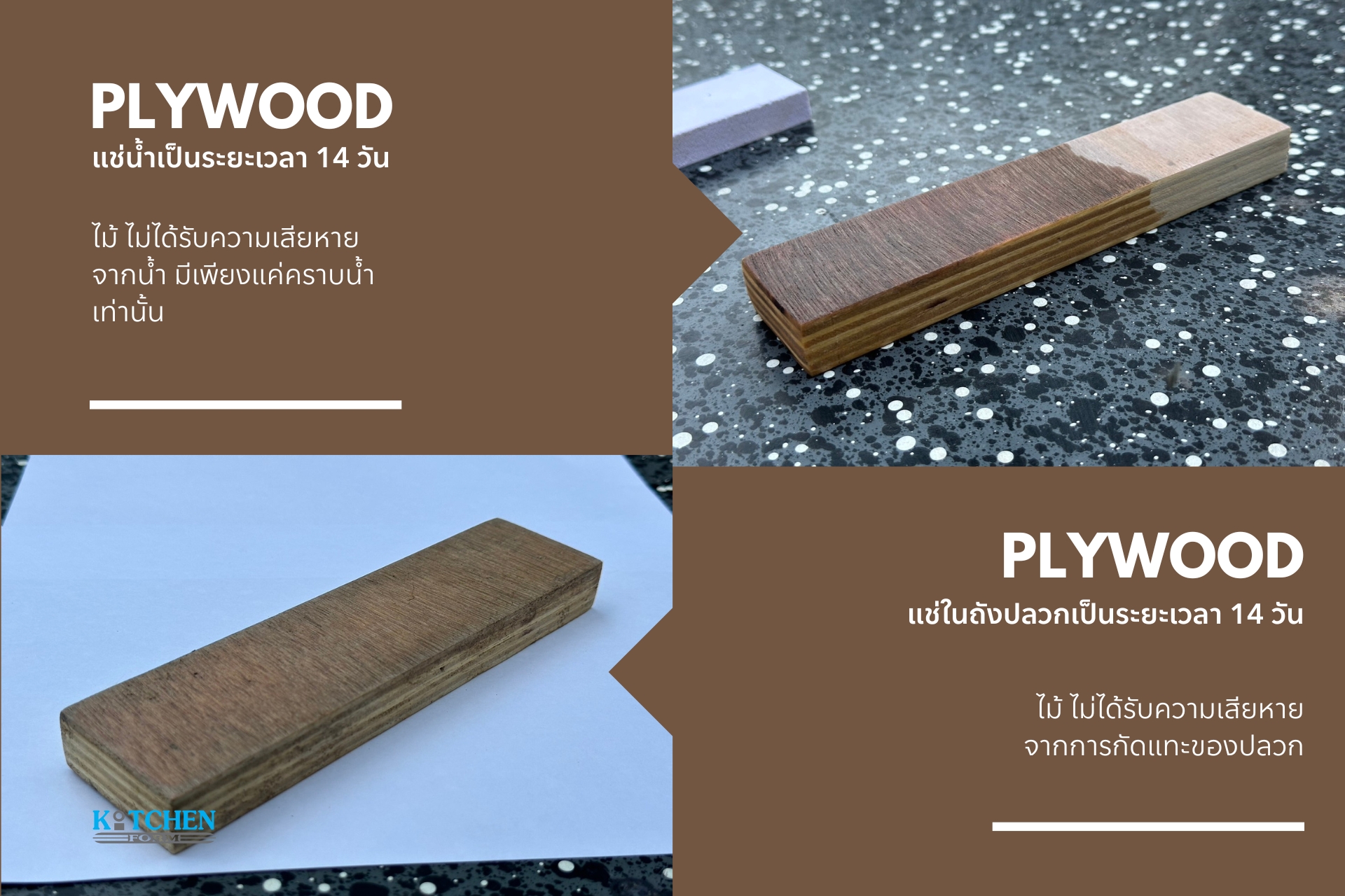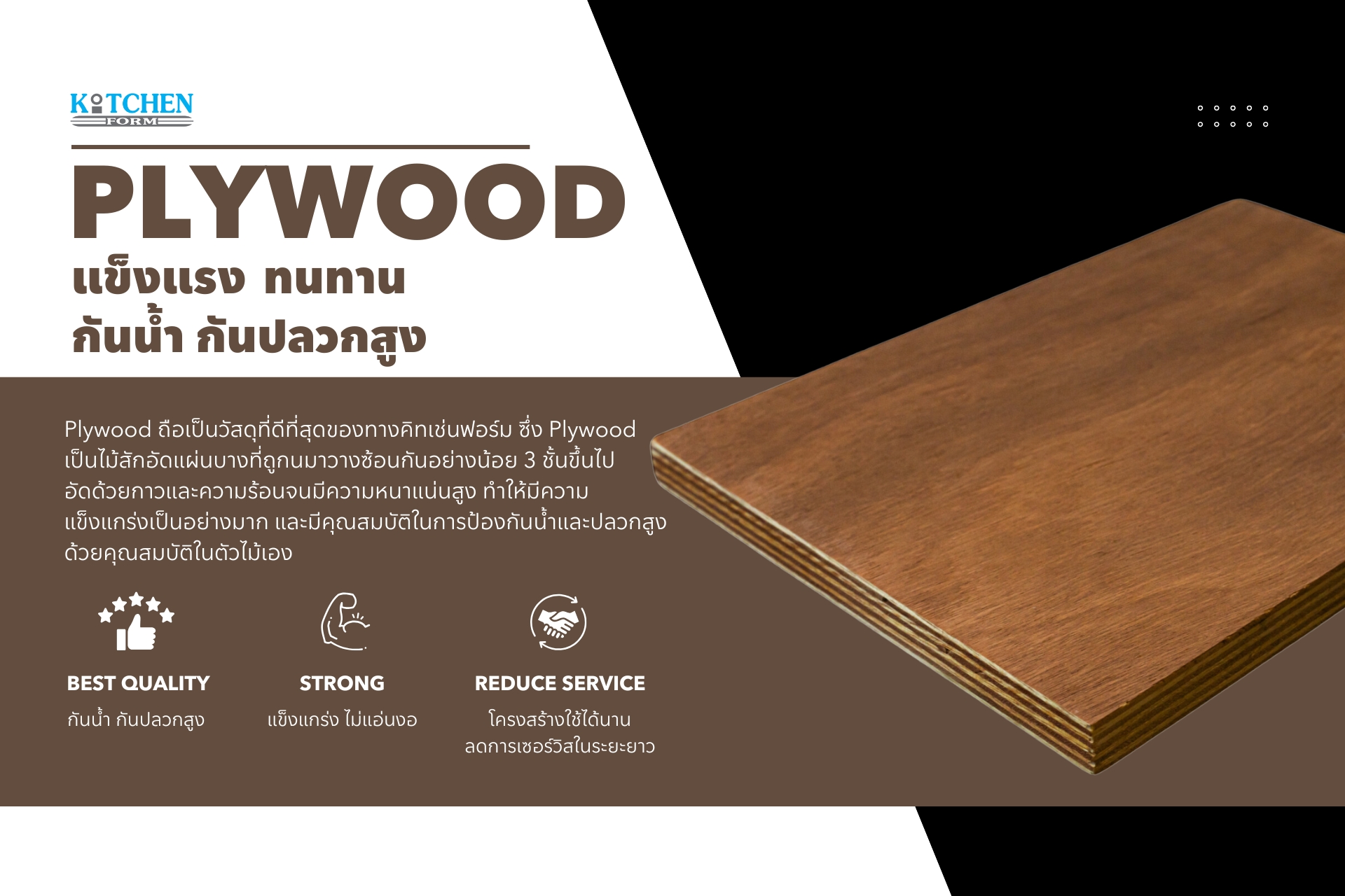 Plywood คือการนำไม้เบญจพรรณอัดยางมาทำเป็นแผ่นไม้อัดหลายชั้น จัดเรียงเสี้ยนไม้สลับทิศเพื่อเพิ่มความแข็งแรง ทำให้ได้วัสดุที่เหมาะกับงานครัวบิ้วอินที่ต้องรับน้ำหนักได้ดี และทนต่อการใช้งานในสภาวะแวดล้อมที่มีความชื้นหรือโอกาสเกิดปลวก
